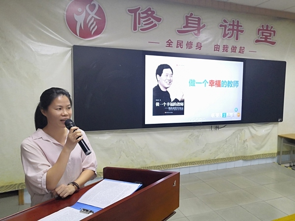 分享會由黃淑華老師拉開序幕,黃老師分享的是陶繼新的《做一個幸福的教師》。陶繼新老師以其獨特的人格魅力、淵博的知識、豐厚的文學素養、詩化的語言、豐富翔實的資料以及對教育的一種憂患意識,深刻地闡述了讀書教學相得益彰,以及讀書對教師發展和學生成長的重要影響,使老師們走向終生幸福的文化之旅。黃老師閱讀過后,感悟深刻,最后說:“做一個幸福的教師,用溫熱的心靈交融稚嫩的心靈,文化素養也許就是滋潤心靈的甘醇。”