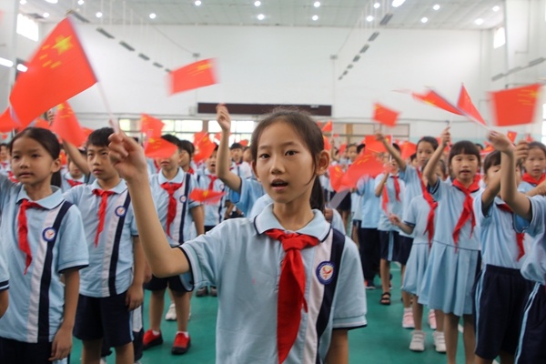 在激昂的國(guó)歌聲中,全體師生起立,飽含深情進(jìn)行升旗儀式,鮮艷的五星紅旗伴隨著雄壯的國(guó)歌聲冉冉升起。