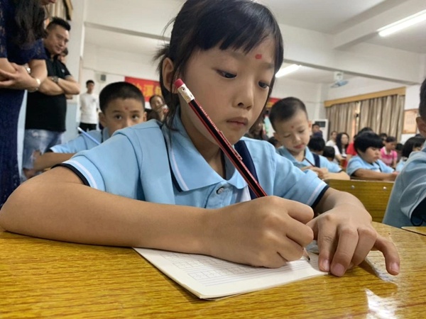 圣獅小學黃校長致辭后,開筆禮正式開始。孩子們在主持人話語的引導下,孩子們正衣冠、朱砂啟智、擊鼓鳴志、描紅“人”字、齊誦弟子規和孝親敬師。在自正衣冠環節中,孩子們知道了著裝要整潔。通過朱砂啟智環節,孩子們得到了領導、老師和家長的祝福,通過點“痣”,開啟智慧,從此眼明心亮,好讀書,讀好書,讀書好。擊鼓鳴志環節中,黃校長擊的三聲鼓聲,聲音響且傳得遠,寓意著孩子們志向遠大。第四環節是啟蒙描紅,黃解球老師分別用粉筆和毛筆示范書寫“人”字。孩子在開筆禮現場寫“人”字,寓意著在人生的啟蒙階段,要學會做人。隨后,一年級新生在丁老師的帶領下,齊誦弟子規的節選部分。最后,為傳承“孝、禮”好家風,發揮圣獅小學校園文化核心“傳承好家風”的傳統,孩子們在主持人的引導下,向老師和父母行鞠躬禮,表示感恩。