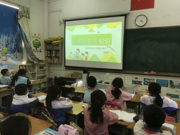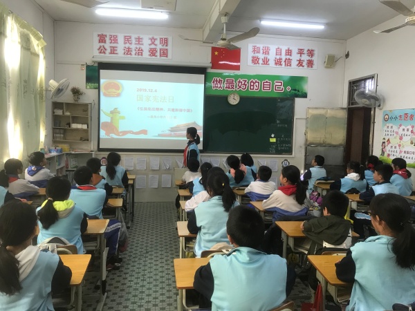 首先,由一(2)班黃楠同學作《弘揚憲法精神,共建和諧中國》國旗下講話,隨后該校校長楊振環倡議全體師生行動起來,積極學習憲法知識。楊校長強調憲法是國家的根本大法,是治國安邦的總章程,將憲法實施日定為憲法日,意義十分重大。他希望同每個同學守法從遵守班規、校規做起,做到懂法、知法、守法,做遵紀守法的好公民,以正確的法制觀念去影響身邊的人,帶動周圍的人,共同營造崇尚法治的社會氛圍。隨后各班利用班隊課開展了小學生憲法知識競賽活動,進一步豐富學生的憲法知識,加深對憲法的理解。