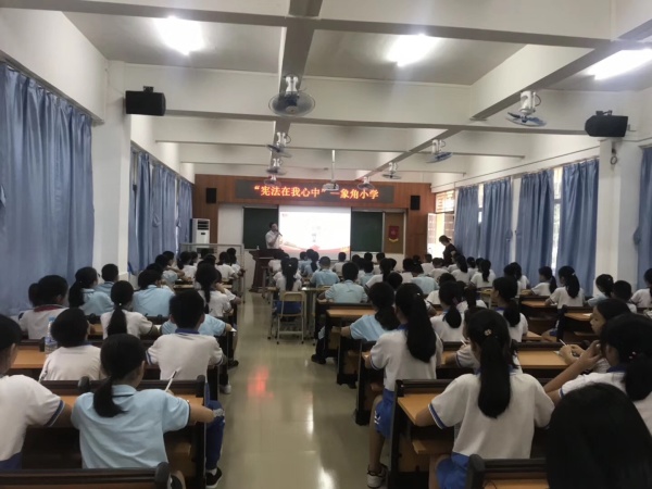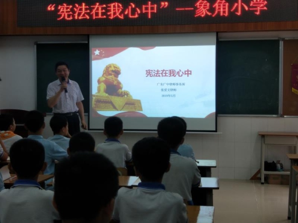 憲法是我們國家的基本大法。學(xué)法、懂法是每一個(gè)青少年成長的必修課。為了弘揚(yáng)憲法精神,加深師生對國家憲法的了解,培養(yǎng)學(xué)生樹立法律意識(shí),從小學(xué)法、懂法、守法。5月30日下午,象角小學(xué)舉行“憲法在我心中”的專題講座,由廣東廣中律師事務(wù)所張律師主講,五年級全體師生參與活動(dòng)。