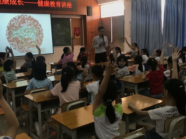 第一環(huán)節(jié)由徐醫(yī)生向大家進(jìn)行護(hù)眼科普知識(shí)講座。他用5月5日是全國(guó)愛(ài)眼日和中國(guó)近視患者居世界首位為切入點(diǎn),引起學(xué)生的好奇心。接著,結(jié)合生動(dòng)有趣的生活故事深入淺出地闡述了近視給學(xué)習(xí)、生活帶來(lái)的極大不便。從關(guān)于我們的眼睛、什么是近視、影響近視的因素、如何預(yù)防近視等幾個(gè)方面教育孩子們保護(hù)眼睛。同時(shí),還通過(guò)提問(wèn)、知識(shí)問(wèn)答等方式宣傳保護(hù)眼睛的方法,提醒同學(xué)們?cè)谧x書(shū)學(xué)習(xí)時(shí),光線要充足舒適,要避免反光,閱讀時(shí)間勿太長(zhǎng),坐姿要端正,看書(shū)距離應(yīng)適中。在家里,睡眠時(shí)間要充足,作息有規(guī)律,多做戶外運(yùn)動(dòng)。徐醫(yī)生充分調(diào)動(dòng)學(xué)生的積極性,大部分學(xué)生發(fā)表自己的看法,深入地認(rèn)識(shí)到愛(ài)護(hù)眼睛的重要性。