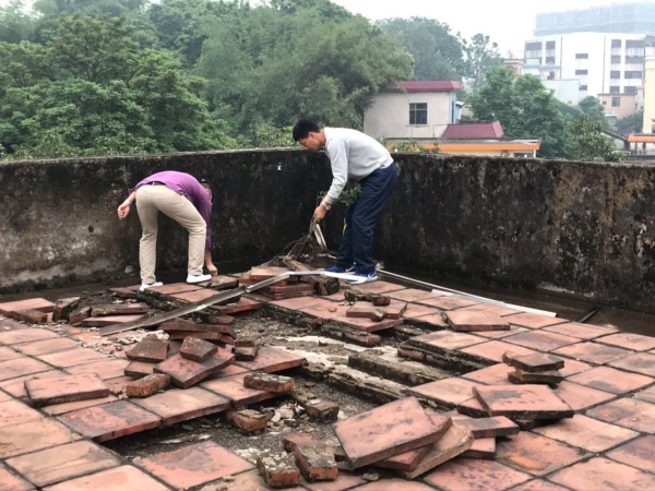 4月15日下午,在校長楊振環(huán)的帶領(lǐng)下,安全領(lǐng)導(dǎo)小組成員員對校園進行拉網(wǎng)式的排查,尤其對修建已久的教學(xué)樓圍墻、門窗、廁所、扶坡、擋土墻等進行了細致的檢查和風(fēng)險評估,對校內(nèi)和周邊排水系統(tǒng)進行了仔細的排查,及時清理樓頂和校內(nèi)排水溝的淤泥。排查中,檢查組對隱患進行詳細的記錄,對危險設(shè)施設(shè)立了警示標志,并及時采取有效措施進行整修。
