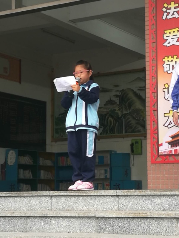 在莊嚴的升旗儀式結(jié)束后,一(1)班的李羿岑同學作題為《傳承傳統(tǒng)文化 發(fā)揚感恩精神》的國旗下講話。她首先用稚嫩有力的聲音有感情地朗誦了古詩:清明時節(jié)雨紛紛,路上行人欲斷魂。借問酒家何處有?牧童遙指杏花村。并講到:我們緬懷先烈,并不僅僅是為烈士生命的消失而悲嘆,更是被他們那偉大的生命價值所震撼,那些英勇的烈士們不愧為炎黃子孫的后代,不愧為新中國永遠矗立的豐碑。因此我們要珍惜來之不易的生活,在家庭做孝敬父母、關懷他人的美德少年,在學校做團結(jié)友愛、創(chuàng)新進取的好學生。