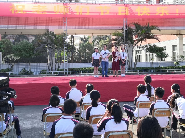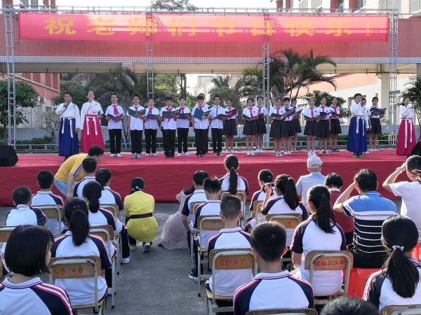 全校兩千多名師生整齊地坐在鶴鳴廣場,音樂響起,活動在兩位學(xué)生主持下拉開了活動的序幕。首先,由今年剛步入初中的啟美級同學(xué)向全體教師朗誦了詩歌《教師禮贊》,聲情并茂地演繹著對老師的感恩。臺下的觀眾十分安靜地聆聽,有些照亮迷,閉上眼睛細(xì)細(xì)體會其中的感恩之情。第二個表演的是啟善級吳錦灝同學(xué)為全體師生演繹的笛子獨(dú)奏《牧笛》,笛聲悠揚(yáng),婉轉(zhuǎn)動聽,博得了廣大師生的贊美與鼓勵。第三個表演由啟真級同學(xué)及老師帶來的合唱《每當(dāng)走過老師窗前》,這首歌完美詮釋了老師的辛勤,歌聲深入人心。