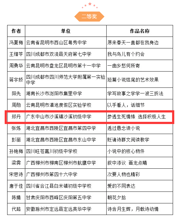 全國第四屆初中群文閱讀錄像課大賽和教學設計大賽于4月10日圓滿結束,沙溪中學鄭丹老師榮獲全國第四屆“初中群文閱讀錄像課大賽”二等獎和教學設計優秀獎。