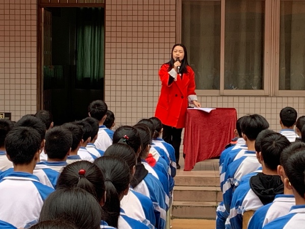 接著教師代表宋芳老師發表了熱情洋溢的演說,她深情地回顧了同學們在校三年以來的學習生活,勉勵全體同學不負韶華、不負師恩、努力拼搏,帶著自信的微笑,贏取中考最后的勝利!