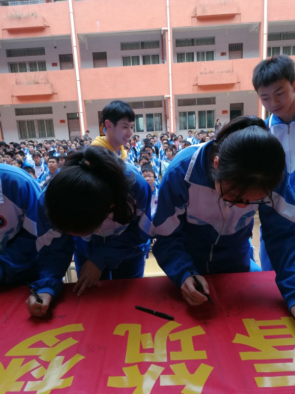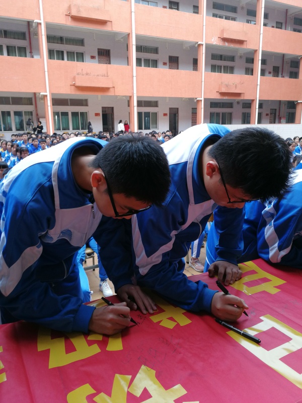 宣誓結束后,各班派代表進行了簡短隆重的“百人誓詞簽名”活動。各班的同學代表表情嚴肅認真,在誓詞橫幅上簽下了自己的名字,這不僅是一次簽名更是沙中學子對學校、對自己、對中考的一份莊嚴承諾!