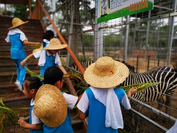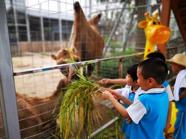 40分鐘的車程,大家終于抵達(dá)目的地——三角迪茵湖生態(tài)農(nóng)莊。翠綠的草地,清澈的藍(lán)天,潔白的云朵,孩子們?nèi)硇耐度氲酱笞匀坏膽驯е小T诒滩ㄊ幯暮谐舜鸥瑁晃桂B(yǎng)動物環(huán)節(jié)讓孩子們與山羊、駱駝、駿馬親密接觸;親手種下一種小苗,為果樹捉蟲,體驗(yàn)農(nóng)民伯伯耕種的辛勞,感同身受何為“誰知盤中餐,粒粒皆辛苦”;品味農(nóng)莊特色蔬果,體味收獲的甘甜;還有刺激好玩的滑草和水上項(xiàng)目,讓孩子們忘卻恐懼,在游戲中成長,變得堅(jiān)強(qiáng);在豪邁的音樂聲中觀看民族表演和蒙古族同胞的馬上雄姿,感受祖國豐富多彩的民族文化,激發(fā)孩子們的愛國情懷。