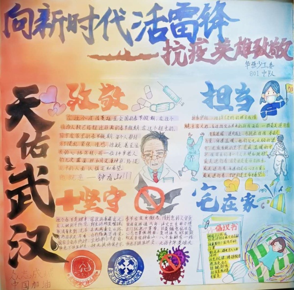 華強少工委的少先隊員們,看著那一個個舍生忘死的逆行者,看著那一幕幕催人淚下的畫面,無不讓隊員們肅然起敬,云隊會之后,華強的隊員們用稚嫩的畫筆,畫出那英雄的背影,用虔誠的心寫下那先鋒的故事。