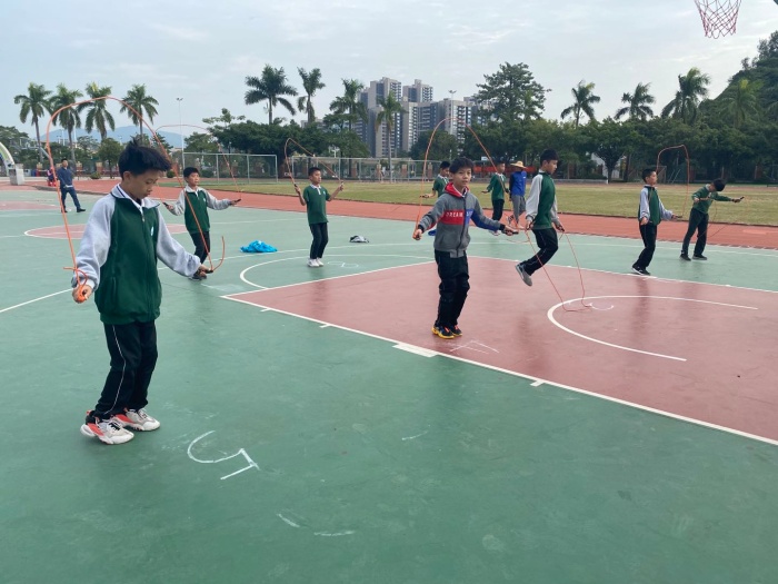 籃球場則是1分鐘跳繩的測試場地。在裁判的一聲令下前,同學們蓄勢待發(fā)。快看!場上的同學們激情飛揚,飛快的繩子跟著他們輕盈的身子擺動,手中的跳繩在空中舞出一條美麗的弧線。每個同學都竭盡所能,測出自己,測出風采。
