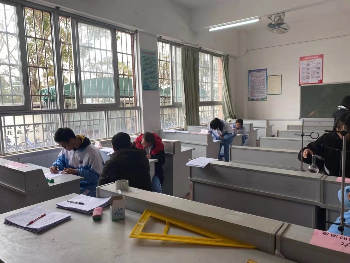 為準備此次物理實驗考核,在實驗操作考核前一個月,教導主任韋紹祖對物理實驗操作考核的物理教師,考務員專門召開會議,作出了工作步署。理綜組組長范修益老師組織全校物理教師,從九道實驗題中選出六道實驗操作考核題,討論并制定了實驗操作考核的具體方案。考核前,積極訓練各班學生熟悉實驗考核流程,規范學生考試紀律;認真布置實驗操作考場,在考場懸掛橫幅,黑板上書寫“實驗操作考核須知”;實驗臺貼“實驗標簽”(實驗序號、名稱),便于學生對號入座。為讓考生準確掌握時間,每個考室還準備一個鐘表計時。
