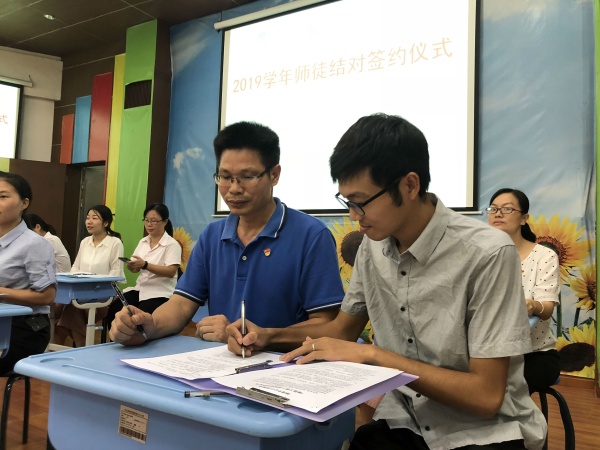 活動中,廖主任宣讀了“師徒結對”教師名單,隨后,張玄、龔道林、熊靜婉等九位青年教師與師傅一起簽寫了教師專業成長“青藍工程”師徒結對協議。