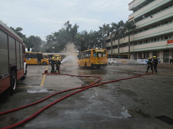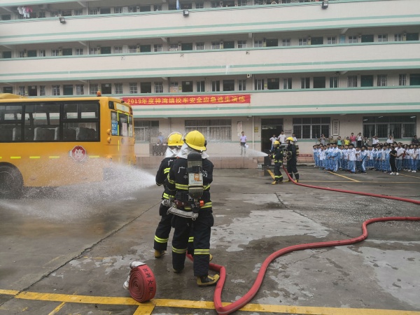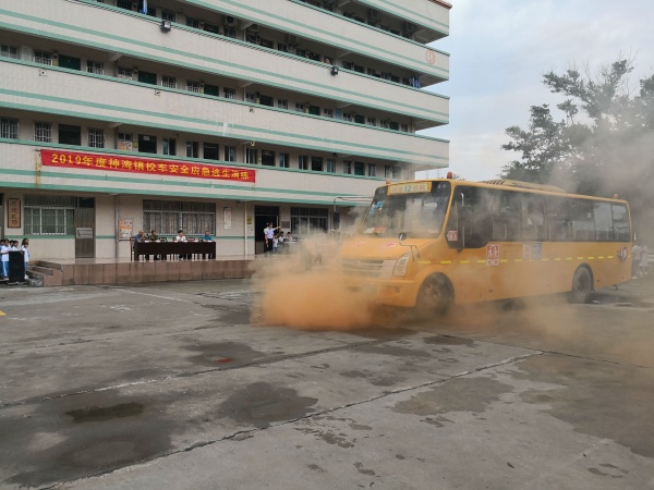 演練分兩個科目進行,科目一是宣傳教育。由神灣鎮交警大隊彭曉藍警官講解校車安全事故中逃生知識。彭警官為學生講解了校車起火時的撤離、校車碰撞時的自我防護、被困車內時逃生錘的使用以及校車逃生門的使用,讓同學們受益匪淺。接著進行了科目二的實景模擬演練中,一輛校車從校門駛入校園停車場,突然有一名學生發現校車的尾部冒出“濃煙”,立即大聲報告:“汽車著火啦!”,司機聽到報告后迅速停車,熄匙,打開車門。跟車老師立即向學生大聲通知:“車著火!大家鎮定!聽從指揮,要快速有序地下車!” 所有學生立即解開安全帶,引導老師利用應急手動開關打開乘客門和應急門,跟車老師發布指令:“車輛起火,立即疏散,聽從統一指揮,不擁擠。”學生們彎著腰,用毛巾、衣物捂著嘴鼻迅速有序地從逃生門和前車門及時撤出,快速撤離到距離校車50米外的安全區域集合,校領導接到報告后馬上報警,消防車迅速趕到現場滅火,交警隨即趕到現場指揮交通,醫院醫生也趕到現場救護受傷學生,跟車老師清點學生人數上報總指揮,全程緊張有序。