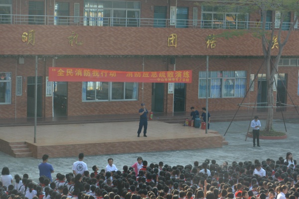 中山市神灣專職消防中隊接到求援電話后,幾分鐘內趕到學校,三輛消防車駛入校園,迅速展開模擬滅火救援工作,全部武裝的十幾名消防官兵對模擬報有火情的三層教學樓某個教室進行救援。三四個水龍頭一起噴水,有正對模擬起火教室的,也有對著模擬教室外圍,以防災情擴大。幾分鐘后,模擬滅火結束。接下來有林教官對這次演練撤離作了評價。隨后開展了消防的知識講座,主要講解遇到火災的撤離技巧和平時防止火災發生的生活常識,迎來了陣陣掌聲。
