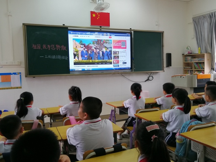 首先,各班班主任結合今年“建黨百年”“中華人民共和國成立72周年”“孟晚舟回國”等話題內容開展此次主題班會。課上,各班班主任根據學情特點,以形式多樣的教學形式引導學生融入本次主題班會課中。有的班級在班主任與“小歌唱家”的帶領下學習愛國歌曲,有的班級則通過觀看視頻的形式進一步了解祖國的發展與變化;有的班級則以“孟晚舟案件”為熱點話題展開討論,并引導學生理解孟晚舟的平安歸國背后代表著中國國力的日益強盛,代表著中國共產黨始終堅定守護人民,為人民服務的決心,代表著我們的祖國始終相信正義,堅定捍衛中國人民的利益,捍衛中國國家的尊嚴。