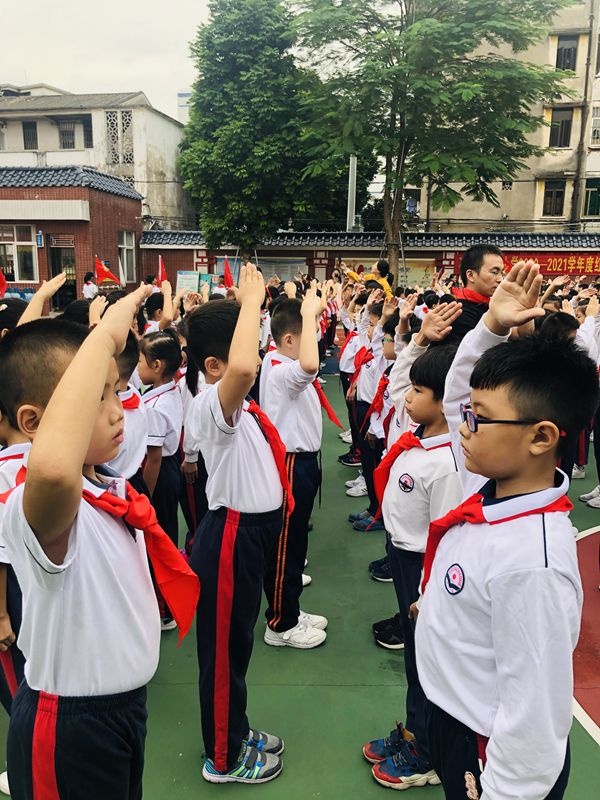 13日早上第一節課,在煙墩校區操場上,舉行 2020學年第一批新生入隊儀式。一、二、三年級全體師生參加活動。