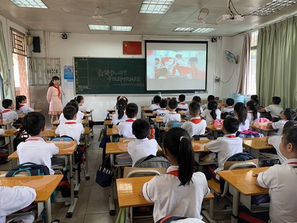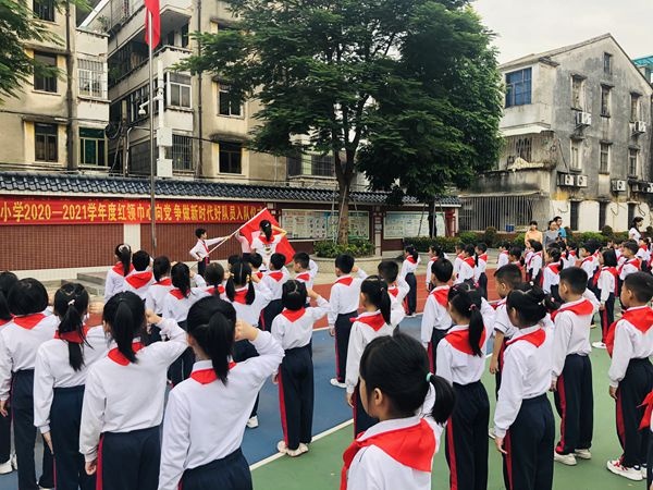 活動主題是童心永向黨,爭做新時代好隊員。全體立正,儀式開始。出旗,奏出旗曲,全體隊員敬禮,唱隊歌,大隊委員會宣讀組建二年級少先隊組織決定,大隊輔導員張志婷老師宣布新隊員名單。三年級隊員為新隊員及新輔導員授紅領巾,佩戴好紅領巾后互敬隊禮;新隊員宣誓,由大隊輔導員領誓;然后吳嬋娟主任為新建中隊授中隊旗,為新建中隊聘請中隊輔導員,授聘書;新隊員代表區艷明老師講話,大隊輔導員講話,呼號,退旗,奏退旗曲,全體隊員敬禮。整個儀式在圓滿和諧的氣氛中圓滿落下帷幕。