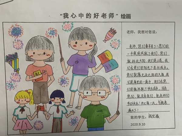 教師不忘初心,立德樹人,學生們更難忘師恩。學校開展了以“我心中的好老師”為題的繪畫活動,學生們紛紛畫出了他們心目中老師的模樣,并為老師寫上了滿滿的祝福與感謝。與此同時,學校的學生禮儀隊一早便整齊站立于校門口,手捧鮮花,代表全體學生為老師們送上節日的祝福。學生滿滿的祝福與感恩聲讓整個校園充滿了溫馨與愛。
