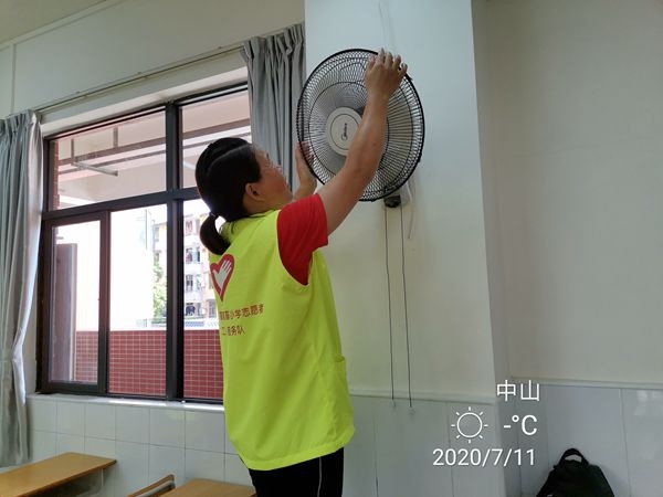 整個清潔過程,以家長為主學生為輔。學生努力地做著力所能及的工作,擦黑板、掃地、拖地、擦桌子……他們嬌小的身影在教室中穿梭著、忙碌著;家長忙碌的身影也遍布各個教室。看!家長正站在桌椅上或梯子上,認真、仔細地清洗著風扇、門框……細致的他們不放過任何一個角落,把教室打掃得一塵不染、干干凈凈。家長之間、學生之間、家長與學生之間,相互協助、相互配合,共同構成了一道美麗的風景線。