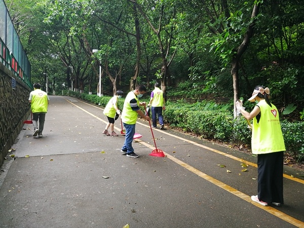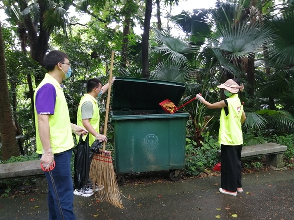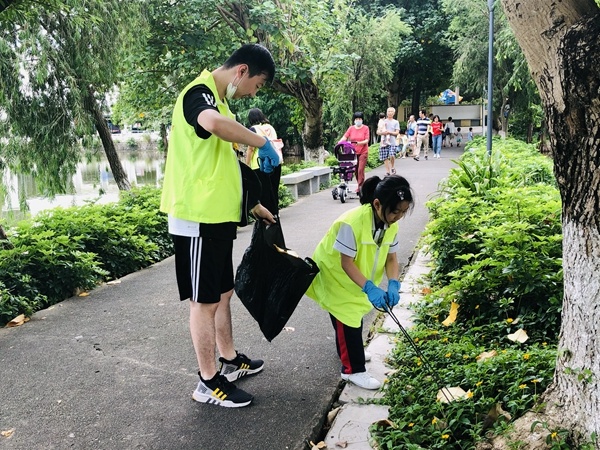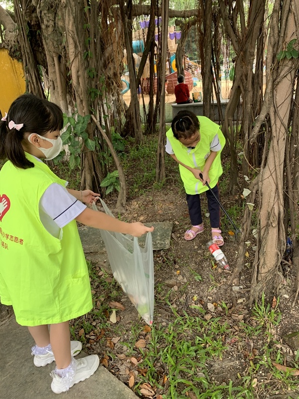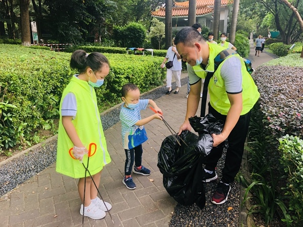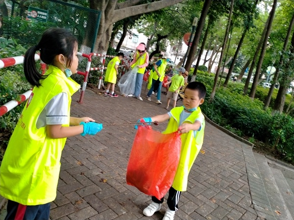 上午9點,志愿者服務隊在各隊長的帶領下,兵分三路:第一服務隊由一(3)班師生、家長組成,主要任務消毒課室;第二服務隊在黃榮勝校長的帶領下,由黨員、教師組成,主要清理煙墩山;第三服務隊在一(2)班師生、家長的支持下,主要消除逸仙湖公園垃圾死角。黃玉媛老師率領了一支綠色小隊“向逸仙湖公園“出發”,有的帶著藍色手套,有的拿著白色的塑料袋,還有的手拿鉗子,戴手套的同學撿垃圾,拿塑料袋的家長收垃圾,就這樣,大家配合的十分默契。不管年紀大小,父母和小義工們都很認真,醒目養眼的義工服成了逸仙湖里一道亮麗的風景線。大路上垃圾不多,于是大家鉆到花圃里發現了大量的垃圾。有游客丟棄的煙頭、紙巾、果皮、瓜子、食品袋等各種生活垃圾,家長們都說沒想到有這么多垃圾,袋子都快裝不下了。一個多小時后,草坪上、過道上的垃圾就被檢光了。大家陸陸續續回到集合點,垃圾都裝滿了袋子,大人和孩子們都走得滿頭大汗,雖然累,心里卻是開心的,我們用行動傳播環保理念,為逸仙湖公園增添了亮麗的色彩,為逸仙湖公園的美好環境貢獻了一份力量。