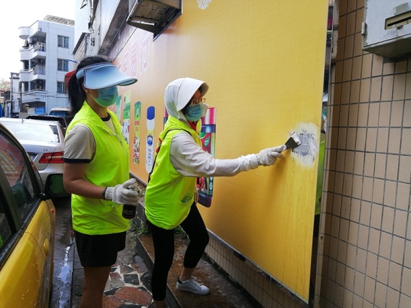 志愿者們利用鏟刀、鋼絲刷、噴壺等工具,認真細致地將道路兩側視野內的路燈桿、公交站牌、沿街墻(樓)體、樹干上等各類亂貼亂畫、小廣告進行全面清理;現場發現張貼、噴涂行為的人,志愿者會對他們積極教育宣講。在大家的努力下,清除墻體廣告、“牛皮癬”多處。