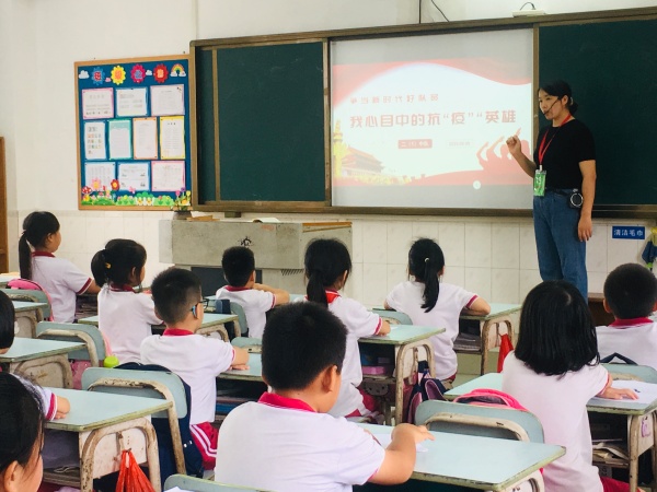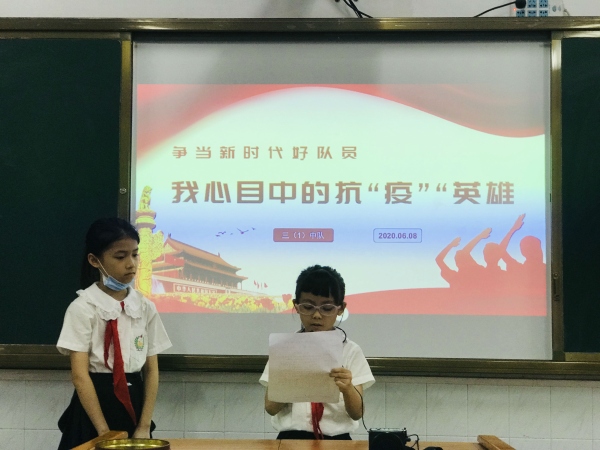 此次主題班會活動在各班老師的有序組織下進行。教室里,孩子們身著禮服,佩戴鮮艷紅領巾,坐姿端正,認真聆聽臺上同學分享他們心中的抗“疫”英雄故事?!拔乙恢痹趯ふ乙粋€英雄的榜樣……” “當疫情暴發時,他又義無反顧地去了武漢……”聽到一個個感人的故事,教室里一次次響起了熱烈的掌聲!英雄們的故事,將像春天的種子,在每個同學的心里都種下了一顆英雄夢,而這些掌聲,代表了孩子們對英雄們崇高的敬仰與欽佩!能在疫情面前挺身而出的人,有科學家、有醫生、有快遞員、有保安等各行各業的人,他們是身邊人,他們是普通人,而他們就是英雄,他們就是我們學習的榜樣!