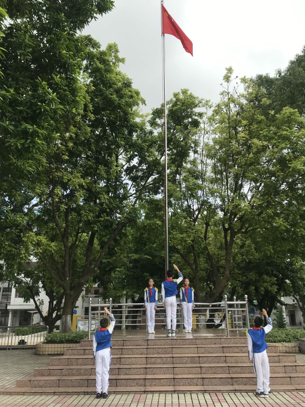 本次升旗儀式由大隊長陳欣怡同學主持,在全體師生的注目禮下,當學校鼓號隊的出旗曲響起,護旗手踏著整齊劃一的步伐,將國旗護送至升旗臺,交至升旗手的手中。激昂的《義勇軍進行曲》響起,全體注目,少先隊員行隊禮,用飽滿的熱情奏唱國歌,五星紅旗在空中冉冉升起。