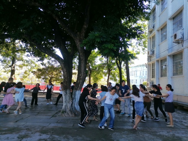 在心理老師的帶領下,活動開始。熱身活動“桃花朵朵開”營造了輕松歡快的氣氛;“大兵步操”活躍氣氛,同時讓教師們打破疫情下諸多新規(guī)帶來的不確定感;“為自己鼓掌”讓教師在自我挑戰(zhàn)中樹立信心;“劃拳接力賽”進一步激發(fā)了教師們的熱情,釋放了壓力,使活動達到高潮;最后,全體教師圍成一圈進行總結分享,感染彼此的生命活力,增強了團隊凝聚力。