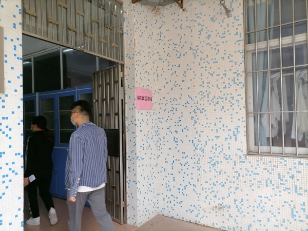 演練現場,根據上級各部門的防控工作要求,在校門口設置了3條入校通道,師生們間隔一米進入校門,值日教師用額溫槍逐一測量體溫。如發現有發熱的學生,現場有家長接送,讓家長直接帶離學校并按照指引就診;如現場無家長接送,由值日組長安排學生到健康觀察室,并立即通知家長接回去就診。