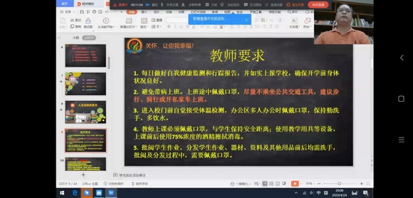 會上,陳校長向全體教師匯報了延期開學期間學校所開展的疫情防控工作,并詳細解讀了返校后的各項防控措施。他指出,做好疫情防控工作是開學系列工作之中最重要的工作。從病毒的難發現、易傳播、無藥物以及學生的來源廣、需聚集、學業重、危險多等特點分析學校疫情防控工作的艱難之處,并強調“越是困難越要向前”。隨后陳校長結合此前學校組織開學演練的圖片,直觀地從人員的防疫要求、場所的防疫要求、防疫工作流程和各時間段防控要求四個方面展開詳細講解。他要求,從學生、家長、教師人人有責,到教室、食堂、衛生間、健康觀察室處處落實,再到人員、制度和物資保障等方面,都要切實落實疫情防控工作要求,務必做到規范流程、細化工作、強化意識。