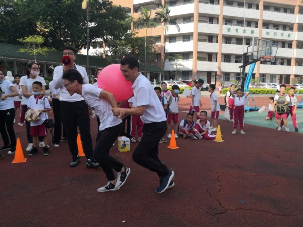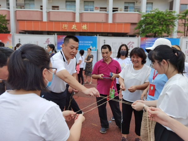 教職工們暫時放下手中的工作精神抖擻地來到運動場,賽前爭分奪秒進行項目的練習,認真做好賽前的準備,好像每個年級組對于第一名都勢在必得。在前胸貼后背的比賽中,年級組之間的競爭著實激烈,團隊之間的配合十分默契,每一位參賽的教職員工的舉動都牽動著在場團隊的心弦,大家彼此加油,互相鼓勁,經過激烈的比拼,最后是三年級組獲得了本次活動的第一名。行政組和級科組長之間的比賽充滿了看點,大家熱血沸騰、全情投入,伴隨著觀眾的歡呼聲和加油聲,展開了激烈的角逐,場面十分熱鬧。