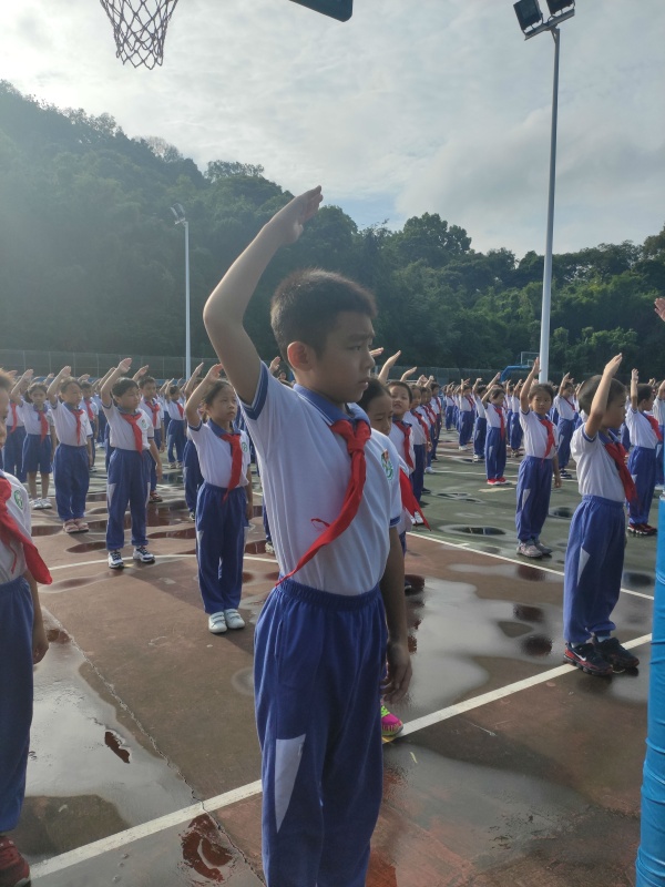 本次升旗儀式由大隊長陳欣怡同學主持,在全體師生的注目禮下,當學校鼓號隊的出旗曲響起,護旗手踏著整齊劃一的步伐,將國旗護送至升旗臺,交至升旗手的手中。激昂的《義勇軍進行曲》響起,全體注目,少先隊員行隊禮,用飽滿的熱情奏唱國歌,五星紅旗在空中冉冉升起。