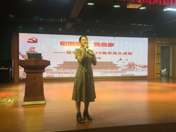 周瑞珍結合中華人民共和國成立70周年之際,回顧發展歷程,緊緊圍繞中國的橋梁建設、高鐵發展、新的“四大發明”和航天技術發展等方面,用史實資料,通過大數據和案例,詳盡展示了國家取得的一系列輝煌成績。生動地講述了以網購、移動支付、共享單車,成為外國人眼中最想帶回的“特產”,進一步托舉起中華民族偉大復興的中國夢,讓人們由衷地贊嘆:“厲害了,我的國!”周瑞珍的講話鏗鏘有力,為現場教師,尤其道德與法治教師指明方向,二小學生們聽后,心潮澎湃,心中燃起熊熊烈火,對祖國的愛更加濃烈。