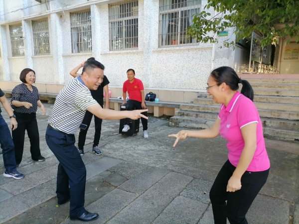 在心理老師的帶領(lǐng)下,活動開始。熱身活動“桃花朵朵開”營造了輕松歡快的氣氛;“大兵步操”活躍氣氛,同時讓教師們打破疫情下諸多新規(guī)帶來的不確定感;“為自己鼓掌”讓教師在自我挑戰(zhàn)中樹立信心;“劃拳接力賽”進一步激發(fā)了教師們的熱情,釋放了壓力,使活動達到高潮;最后,全體教師圍成一圈進行總結(jié)分享,感染彼此的生命活力,增強了團隊凝聚力。