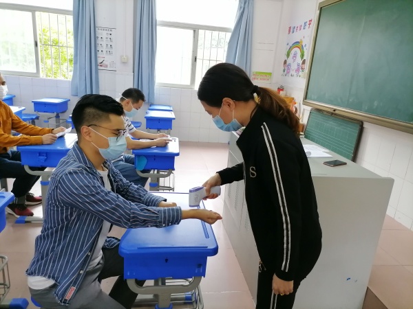 演練現場,根據上級各部門的防控工作要求,在校門口設置了3條入校通道,師生們間隔一米進入校門,值日教師用額溫槍逐一測量體溫。如發現有發熱的學生,現場有家長接送,讓家長直接帶離學校并按照指引就診;如現場無家長接送,由值日組長安排學生到健康觀察室,并立即通知家長接回去就診。