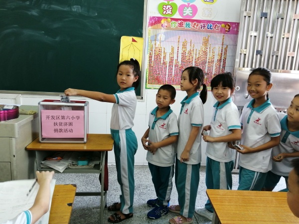“贈人玫瑰,手留余香”,每年的6月30日是廣東省的扶貧濟困日,為了弘揚中華民族傳統(tǒng)美德,積極踐行社會主義核心價值觀,開發(fā)區(qū)第六小學響應省捐款活動的號召,于6月28日開展“學子獻愛心”捐獻活動,號召全體學生伸出援手,為弱勢群體捐款獻愛心。首先各班班主任在班級進行愛心教育,講述本次愛心捐款的意義,動員全體學生積極行動起來,為貧困人員獻出自己的愛心。