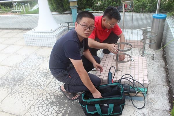兩位氣象員下午兩點多到達學校觀測點,為氣象觀測站更新舊設備。由于舊的儀器設備多為玻璃制品,經(jīng)受長期曝曬雨淋,容易受損,中山市氣象局工作人員在三天前送儀器時看到了這些,決定無償提供更好的設備,特意送給學校雨量筒,淺層地溫,量杯,干濕球溫度等一批器材,撤除了易生銹的鋅鐵質雨量筒等舊設備,安裝了不銹鋼的新設備,為地理氣象觀測站的同學們提供優(yōu)質測量用具。