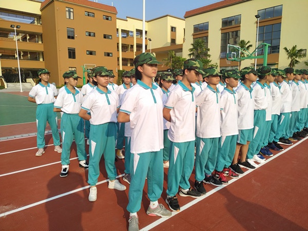 在開營儀式上,沙泉源副校長作了軍訓動員。他首先指出軍訓的目的,即通過嚴格的軍事訓練提高同學們的政治覺悟,激發愛國熱情,增強國防觀念和國家安全意識,增強組織紀律性,提高責任擔當能力,養成良好的學風和生活作風。為班級爭光,報答父母。接著,軍訓團團長嚴教官發言,他希望同學們要端正態度,服從命令,嚴守紀律;苦練基本功,磨煉意志;鞏固訓練成果,形成良好習慣。其后,全年級10個班級被分為5個中隊,隊列整齊,在教官的帶領下,前往運動場,為期兩周的軍訓就此拉開了。“立正、稍息、齊步走、立定”的口令,操場上整齊劃一,一排排整齊的方隊傳遞著同學們的意氣奮發。“向右看齊——向前看——齊步走”,炎炎烈日下,在教官的口令聲中,個個汗流滿面的“小兵”昂首挺胸、精神抖擻,沒有一個叫苦叫累。