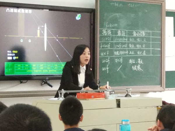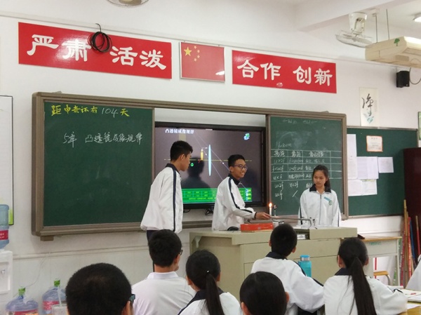 研討活動首先由紀雅學(xué)校的劉麗娜老師上了一節(jié)“凸透鏡成像規(guī)律”復(fù)習(xí)課。“凸透鏡成像規(guī)律”是教學(xué)章節(jié)中比較難理解的一個知識點,歷來是中考的重要考點。課堂上,劉老師熟練運用“小組合作 雙模合一”的教學(xué)模式來組織教學(xué),首先通過學(xué)生自主學(xué)習(xí)、組內(nèi)交流、組間展示等環(huán)節(jié)解決了對基礎(chǔ)知識的復(fù)習(xí),然后再組織學(xué)生的現(xiàn)場實驗演示,再現(xiàn)了凸透鏡成像的幾大規(guī)律,借用實際觀察,非常巧妙地引導(dǎo)了學(xué)生對成像規(guī)律的理解和有效記憶。最后,劉老師又通過質(zhì)疑環(huán)節(jié),由多組學(xué)生展示、解釋了幾個實驗中的難點,進一步落實了“凸透鏡成像規(guī)律”的知識學(xué)習(xí)。整個教學(xué)過程,學(xué)生始終是學(xué)習(xí)活動的主體,課堂學(xué)習(xí)氣氛輕松、活躍,非常高效地完成了教學(xué)。