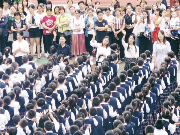8:30,伴著激昂的樂曲,孩子們邁著自信從容的步伐踏步走進展示區。聽著一、二年級孩子們字正腔圓的國學經典誦讀聲,看著三、四年級同學們優美的廣播體操,家長們時時發出贊揚與認可之聲。在大家期待的目光下,伴隨著響亮的跑操音樂,由五、六年級全體同學組成的跑操隊伍如長龍一般有節奏地向前移動。同學們昂首挺胸,目視前方,隨著他們矯健的步伐,展示區內不一會兒就呈現出“XM”——“新苗”的拼音字母首寫。家長們紛紛拿出手機拍攝,留下這難忘的一幕。
