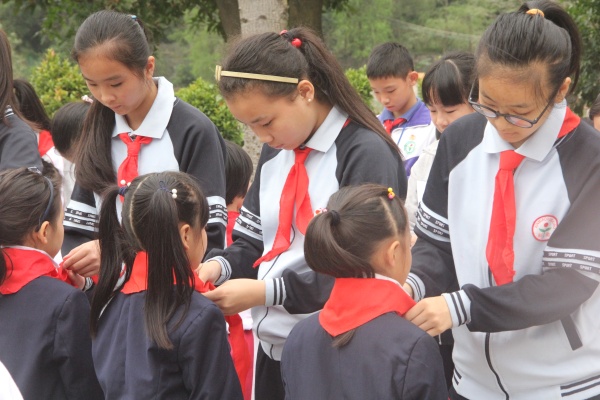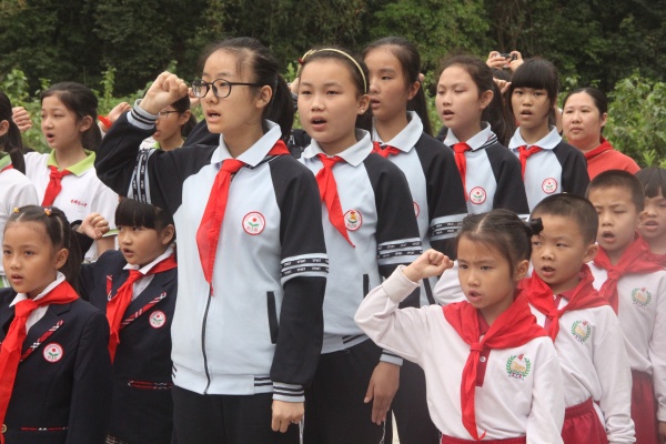 代表發(fā)出愛國、愛火炬倡議,呼吁大家積極行動起來,從我做起,從小事做起。然后開始新隊員入隊儀式,老隊員鄭重地為新隊員系上鮮艷的紅領巾,新隊員個個神采奕奕,與老隊員互敬隊禮,并在隊旗下莊嚴宣誓、呼號,表達出他們的心聲——“為共產(chǎn)主義事業(yè)貢獻力量”。