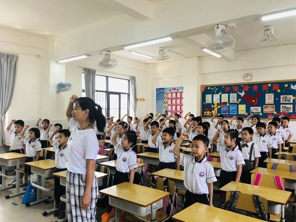 各中隊輔導員制作了精美的課件,為同學們詳細介紹了隊名、隊旗、隊徽、隊標志、隊禮、隊歌、呼號等有關少先隊的知識,理解了“先鋒”一詞的含義,還就中國少年先鋒隊光榮的歷程等知識作了解讀。同學們認真地學習敬隊禮,學習呼號,學習戴紅領巾,跟著老師讀誓詞,稚嫩的聲音里透著堅定,緊握的拳頭顯示著信心;唱隊歌,唱一唱《少年先鋒隊隊歌》——“我們是共產主義接班人,繼承革命先輩的光榮傳統,愛祖國,愛人民,鮮艷的紅領巾飄揚在前胸……”為了加入自己夢寐以求的少先隊,孩子們個個都精神飽滿,在老師的指導下群情激昂,高唱著隊歌。一張張純真的小臉流露著孩子們對隊組織的向往和崇敬,清脆的童聲表達著孩子們即將成為少先隊員的自豪和喜悅,也流露著他們加入少先隊組織的堅定決心;敬隊禮,需要充分發揮家庭的作用,學校與家庭密切配合,要求每個同學在入隊前做一件好事。內容豐富的隊前教育,使一年級新生初步了解了少先隊,讓他們擁有少先隊生涯的美好開端,也培養了他們的組織意識,增強了作為一名少先隊員的強烈歸屬感和自豪感!