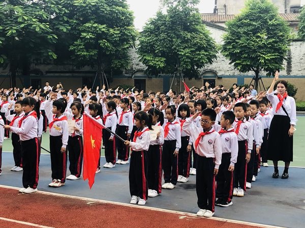 13日早上第一節(jié)課,在煙墩校區(qū)操場上,舉行 2020學(xué)年第一批新生入隊儀式。一、二、三年級全體師生參加活動。