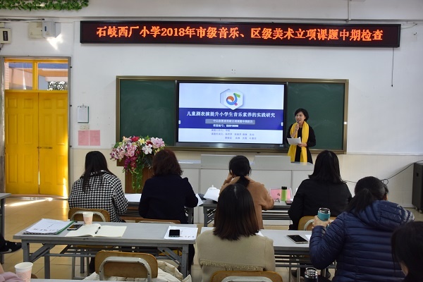 接著,課題主持人鄧娟向?qū)<依蠋焸冏鳌秲和瘎”硌萏嵘W(xué)生音樂素養(yǎng)的實(shí)踐研究》的課題中期報(bào)告。她從課題工作方案、實(shí)施情況、階段性成果、經(jīng)費(fèi)使用情況及存在的問題和下一步的努力方向都進(jìn)行了詳細(xì)的陳述和匯報(bào)。
