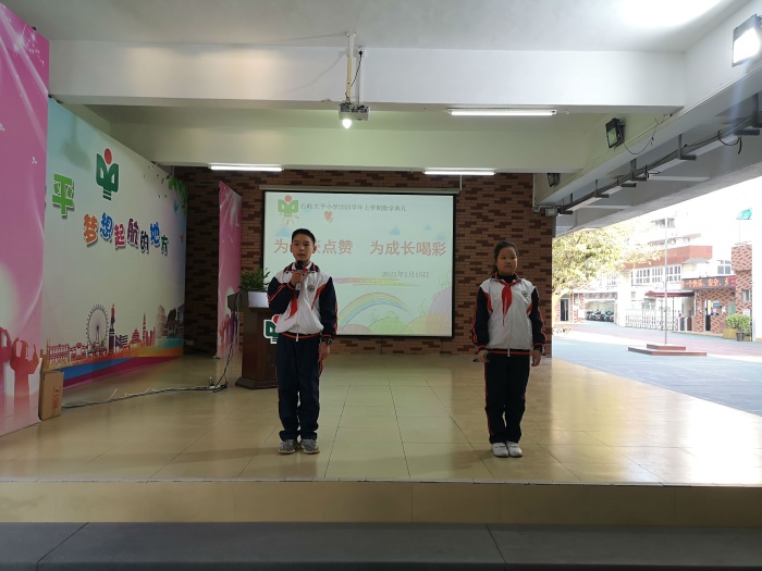 陳惠良主任就石岐太平“小腳丫”的特色寒假3+1實踐作業進行了解讀。黃喜雪主任宣讀了本學期獲得市、區級獎勵的同學名單,他們一起上臺舉行了頒獎儀式。一張張獎狀映紅了學生們的笑臉,激勵著孩子們不斷進取,取得更加優異的成績。