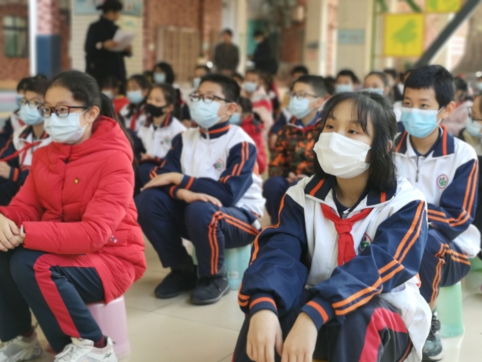 為避免在校園聚集,本學期的散學典禮同學們分散在班級,以聽廣播的形式進行?,F場只有三十多位獲獎同學代表坐在舞臺下,他們做足了防控措施:全程佩戴口罩,互相間隔一米的距離……