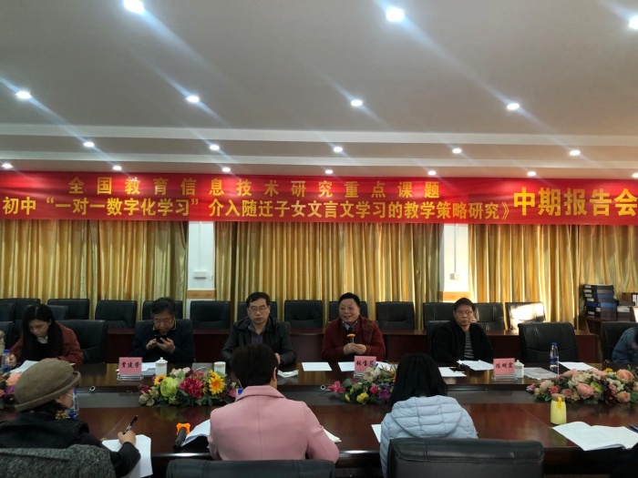 1月18日下午,由北區(qū)中學(xué)主持的全國(guó)教育信息技術(shù)研究重點(diǎn)課題《初中“一對(duì)一數(shù)字化學(xué)習(xí)”介入隨遷子女文言文學(xué)習(xí)的教學(xué)策略研究》中期報(bào)告會(huì)在北區(qū)中學(xué)舉行,報(bào)告會(huì)邀請(qǐng)了中山市教師發(fā)展中心、中山市中小學(xué)教師信息技術(shù)應(yīng)用能力提升工程2.0項(xiàng)目辦公室主任吳寒冬,教育部國(guó)培計(jì)劃專家、廣東省特級(jí)教師、中山名師陳明宏,中山市教育教學(xué)研究室初中語(yǔ)文教研員張寶華和中山市教育技術(shù)中心課題總負(fù)責(zé)人賈建榮四位課題專家蒞臨指導(dǎo)。課題組全體成員及北區(qū)中學(xué)語(yǔ)文科組全體老師參加了本次報(bào)告會(huì)。