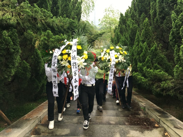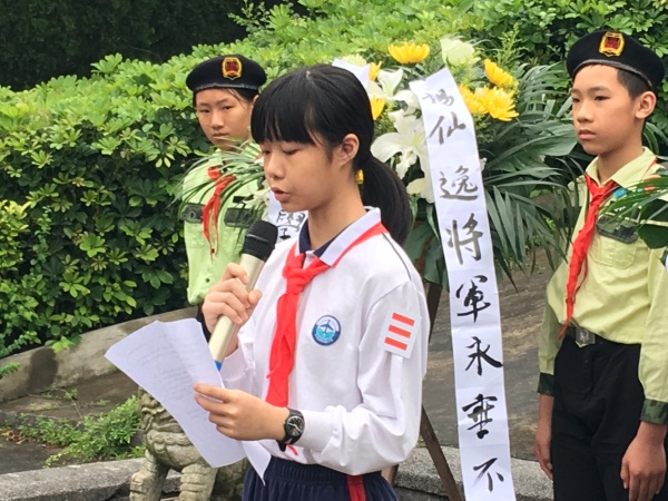隊員們穿著整齊的制服,排著整齊的隊伍,手執花圈,邁著沉重的步伐,緩緩走在將軍墓前的臺階上,臺階兩旁郁郁蔥蔥的松柏樹就好像兩排莊嚴的衛兵。緬懷活動由兩校隊員代表主持,兩校隊員代表分別作了講話,他們在講話中說:“悼念和緬懷楊仙逸將軍‘航空救國’的偉大精神,他的英雄氣概將永遠銘記在隊員們心中,他的英雄事跡將永垂千古”。最后,輔導員王冠華老師也作了講話,他在講話中指出:楊仙逸小學與北臺小學都同屬于紀念楊仙逸將軍的學校,有著同樣的革命根源。兩校聯合開展掃墓活動也是首次,意義重大。他勉勵隊員們要感恩革命前輩的英勇付出,珍惜今天來之不易的美好生活,努力學習,報效祖國。最后,王老師帶領全體隊員呼號!