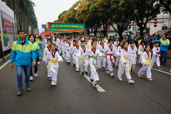 由校跆拳道隊組成的游行方隊,他們身穿跆拳道服,精神抖擻、意氣風發,走在興中道上,受到了圍觀群眾的熱烈喝彩。